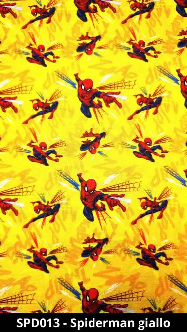 Le fotografie che descrivono la cuffietta chirurgica Spiderman giallo sono da considerarsi un semplice esempio, poiché ogni prodotto è unico. La posizione di eventuali personaggi o motivi inerenti la fantasia scelta sono, pertanto, casuali e dipendono dal taglio della stoffa.